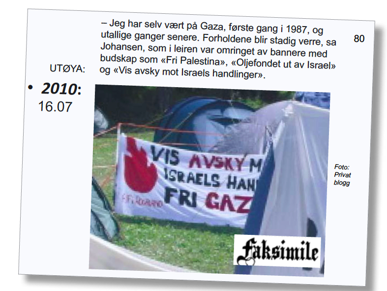 Ivar Fjeld gav i 2013 ut boka “Den Rød Grønne Terrorøya”. Den dokumenterte hvordan samarbeidet mellom AUF og al-Fatah Youth, PLO sin ungdomsbevegelse, førte til at “Palestina” ble opprettet på Utøya i 2010. I 2009 fikk muslimer arrangere bønnemøter i lagshuset på AUF-øya. Boka er utsolgt, men tilgjengelig som PDF for 100 kroner. ivarfjeld@yahoo.com